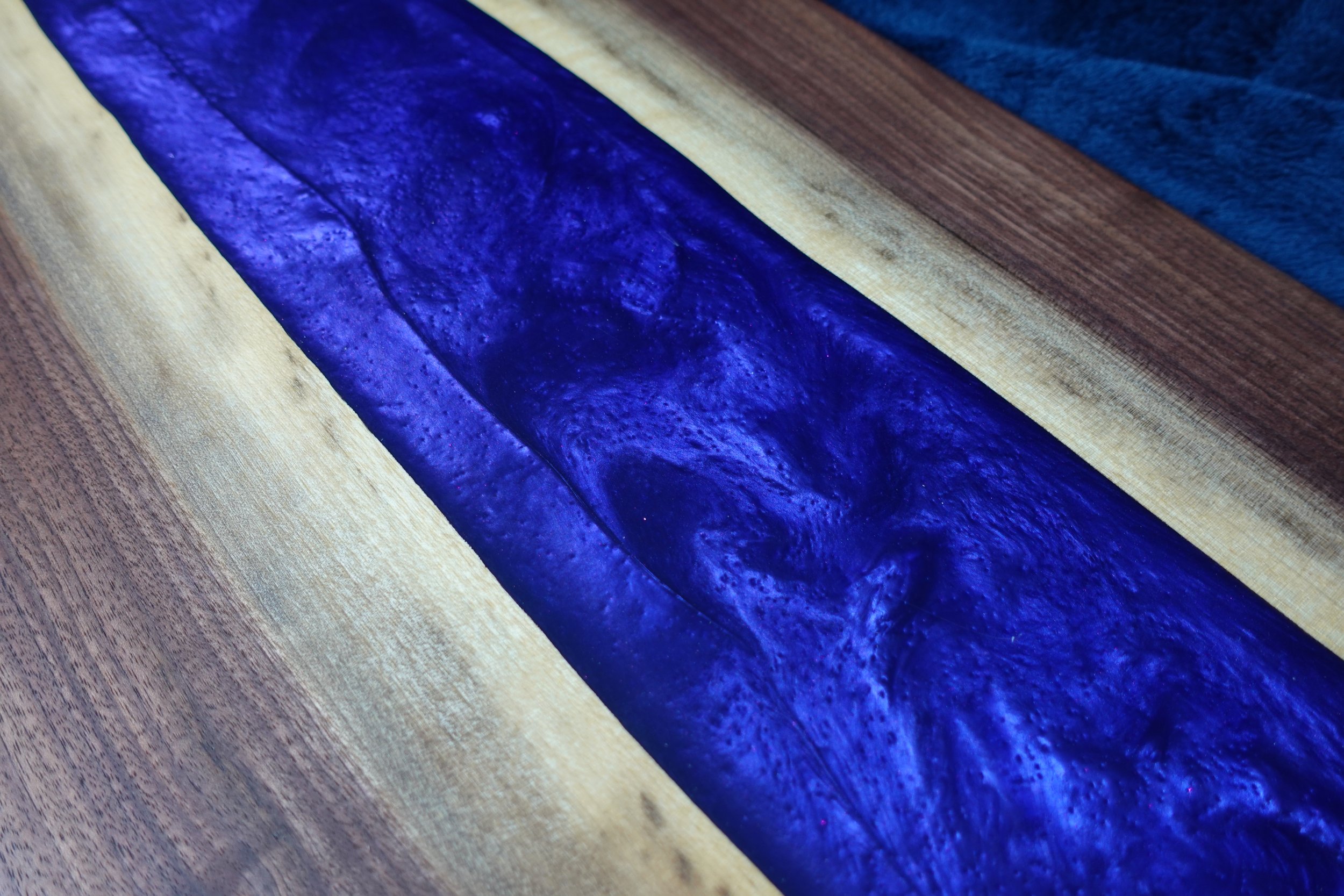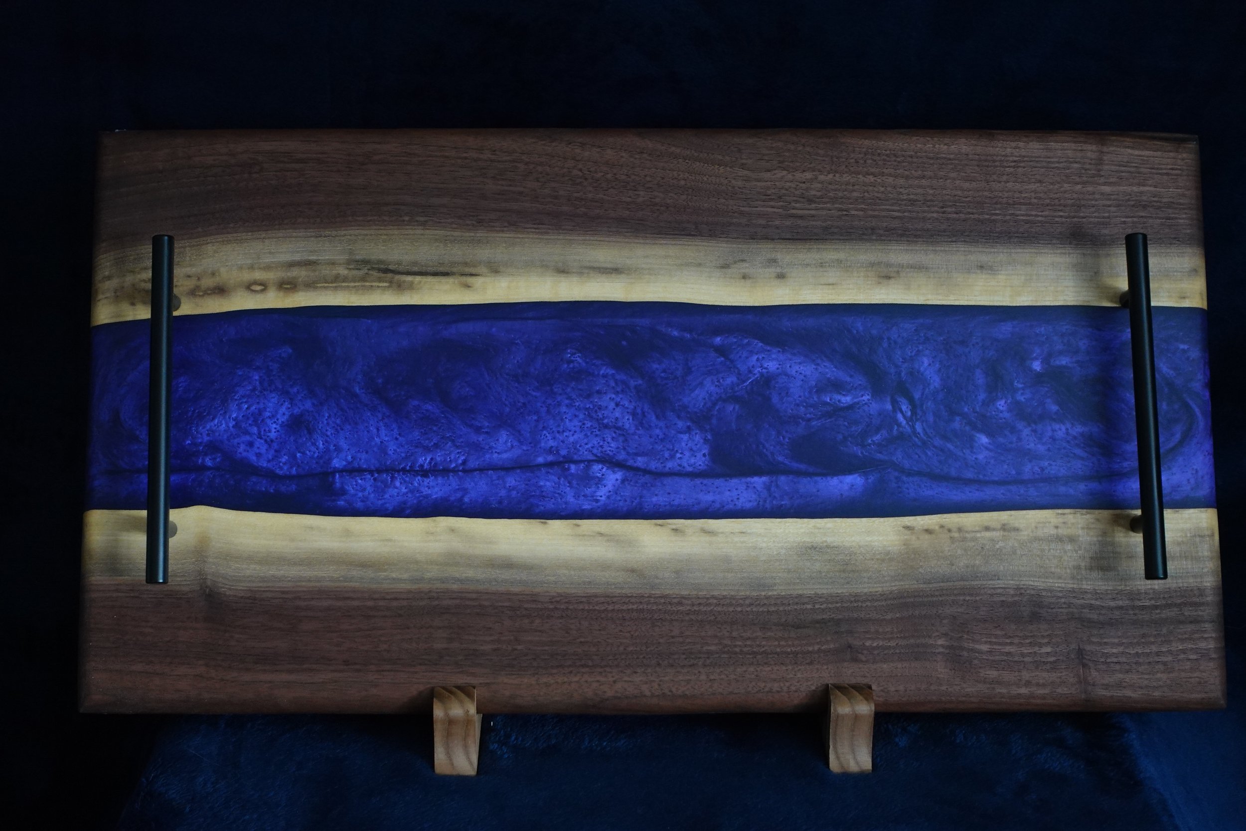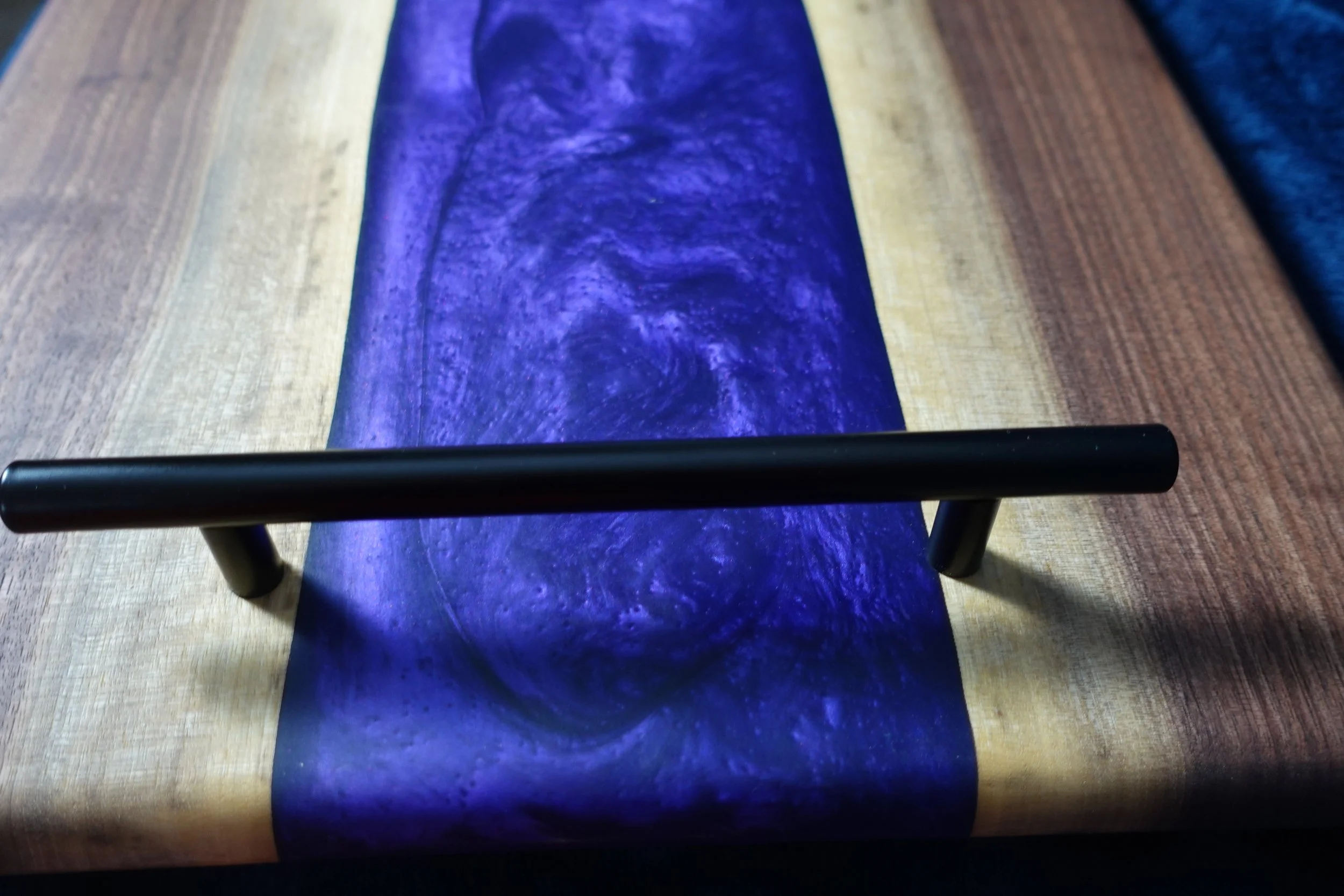 Custom Walnut & Purple Epoxy Charcuterie Tray – Handmade in Nova Scotia This one-of-a-kind serving tray is truly a showstopper. Crafted by hand right here in Nova Scotia, it features a stunning combination of rich walnut and vibrant purple epoxy, accented with sleek black handles and small rubber feet. Size: 13” x 25” – Perfect for entertaining, charcuterie spreads, or as a bold home décor piece. While the photos may appear blue, the epoxy is actually a deep, vivid purple that really pops in person. Finished with Rubio Monocoat, a premium hard wax oil that’s durable, food-safe, and can be refreshed over time to keep it looking its best. This tray is as functional as it is beautiful, whether you’re hosting guests or just treating yourself to something special, it’s guaranteed to stand out.